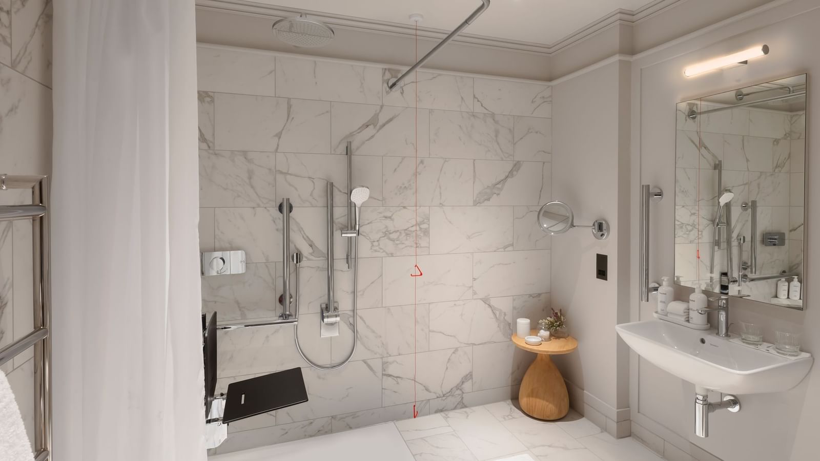592 Sq Ft King Up To 2 GuestsOur spacious, accessible suites are situated on the lower ground floor and offer exceptional comfort, with fully accessible, luxurious bathroom facilities. Large windows fill the room and living space with abundant natural light from the terrace above, highlighting the rich decor and creating a welcoming environment for guests to relax and unwind. These rooms are specifically designed for accessibility with wet room style bathrooms, wider doorways and additional floor space. Due to the historic nature of our building they are accessed from reception on the ground floor and sit on the lower ground floor in the second townhouse.